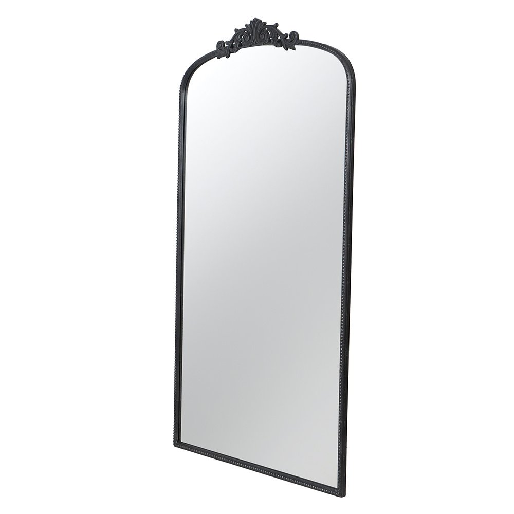 Boasting a grand arched silhouette, a smooth black frame, and an intricately crafted regal adornment at the head, this full-length mirror blends classic baroque style with versatile function. Measuring a large 66H x 36W x 2D, it will capture your whole reflection with ease while also elevating the decor in your living room or bedroom.